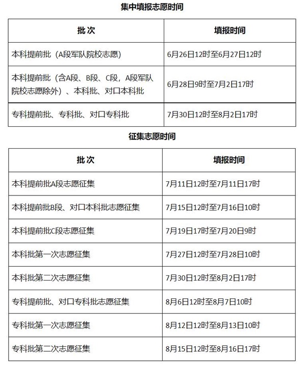 军队(含武警,下同)院校招生计划安排在本科提前批A段,实行顺序志愿投档,设1次集中填报志愿和1次征集志愿,考生每次可填报1所学校,每所学校设6个专业志愿和1个专业服从调剂选项。集中填报志愿时间为6月26日12时至6月27日12时。