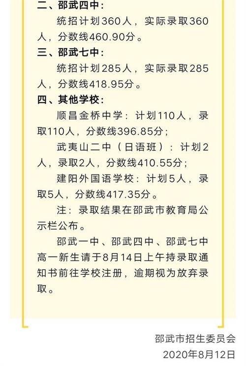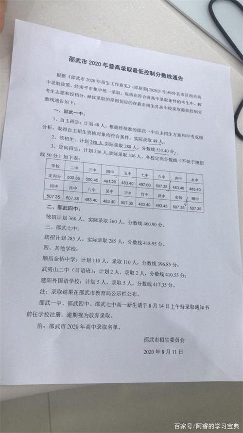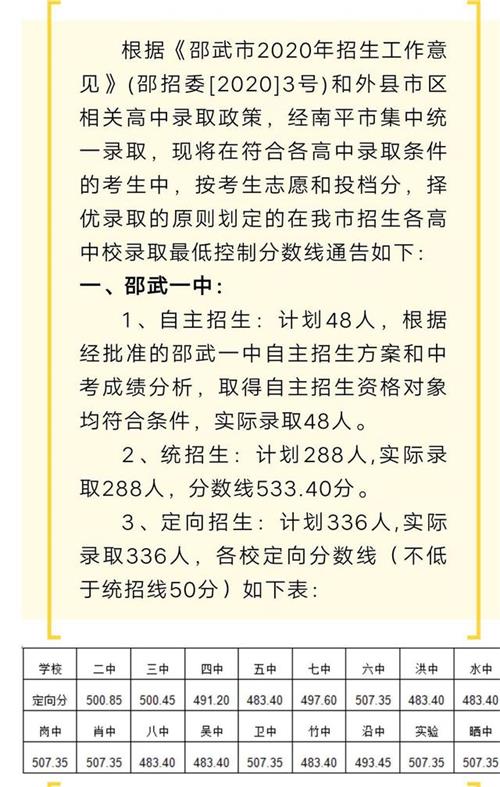 12日上午,邵武市教育局发布了本市中考录取分数线,其中邵武一中统招分数线为533.4分,具体情况如下: