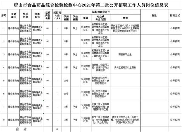 2、唐山市食品药品综合检验检测中心面向社会公开招聘事业编制工作人员8名。
