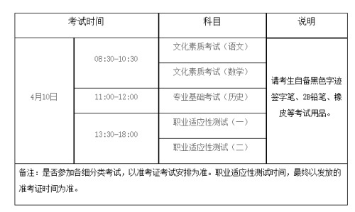 职业技能测试分为专业基础考试和职业适应性测试两部分,满分450分。其中专业基础考试科目为“历史”,满分100分。具有“历史”科目学考合格性考试成绩的考生,使用该科目学考成绩折算替代。没有“历史”科目学考成绩的考生,须参加专业基础考试,如未参加,则专业基础考试部分成绩为零。学考等级折合成绩如下:A-90分,B-75分,C-60分,D-45分,E-30分。